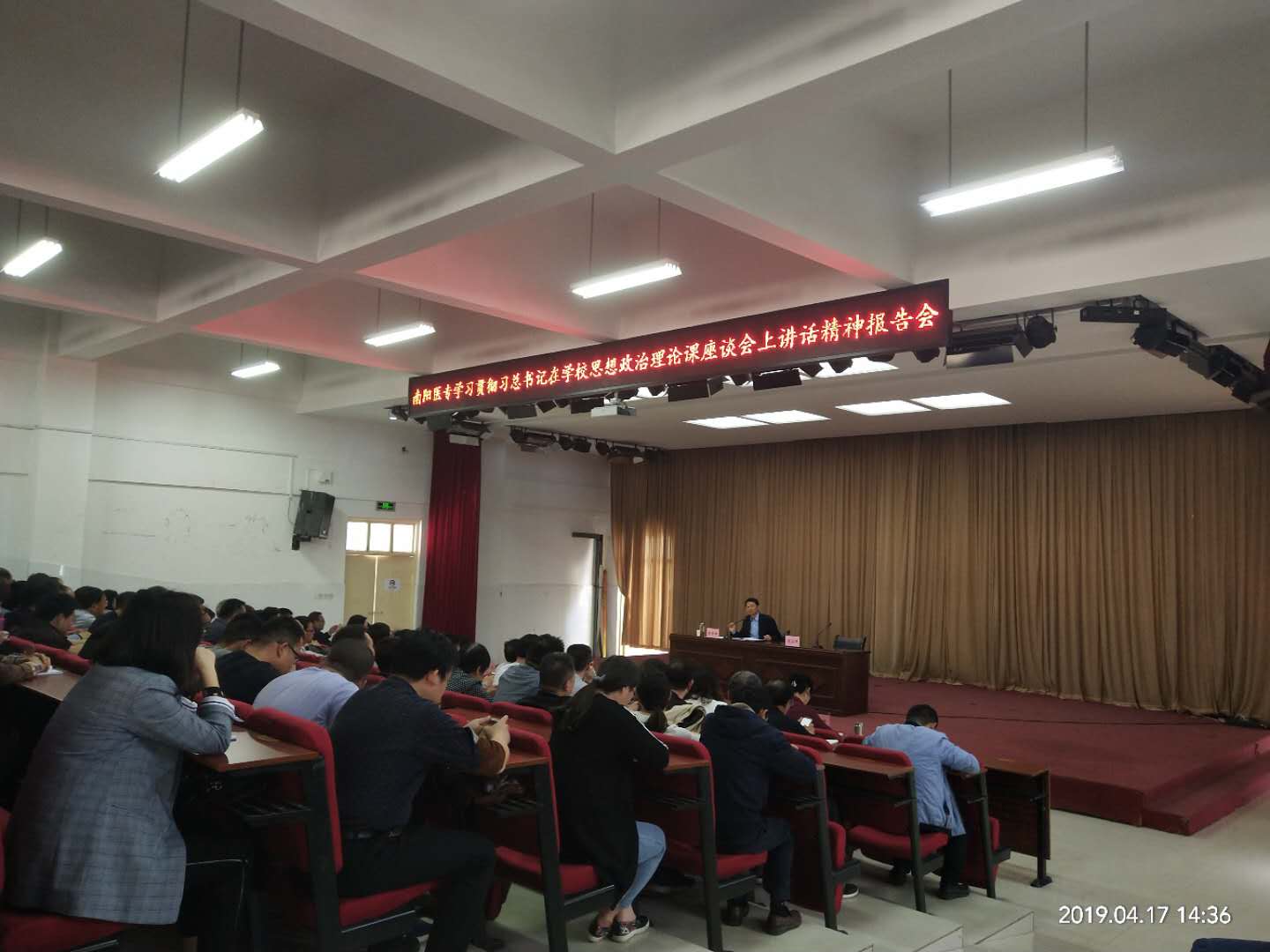 4月17日下午在新东区报告厅举办学习总书记在学校思想政治理论课教师座谈会上的讲话精神报告会。特邀河南省思政教育专家、参加习近平在京主持召开学校思想政治理论课教师座谈会的我省思政教师代表、原信阳师范学院9428cn太阳集团院长程东阳教授主讲。全体校领导出席报告会,学校副科级以上干部、全体专兼职教师、全体辅导员及部分学生代表参加报告会。报告会由校党委副书记逵应坤主持。