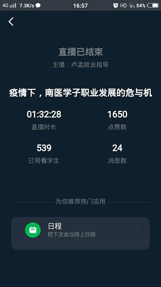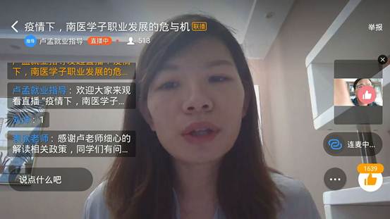 南医思政云“云课堂”第3讲于5月3日下午3:30在钉钉直播群“领航认知迭代成长”1-4群内进行,“云团队”成员卢孟老师以“疫情下,南医学子职业发展的危与机”为题,通过结合当前疫情形势对2020年国家就业政策保障进行讲解。本次“云课堂”卢老师从“疫情下国家的就业政策保障”和“南医学子的毕业去向”两个方面,结合今年线上招聘形势,针对后疫情时代下我校南医学子就业该何去何从进行指导,帮助学生们认清就业形势、树立就业信心。通过对“云课堂”前期和后期调查问卷数据分析,本次“云课堂”达到预期效果,唤醒了我校毕业生积极参与线上应聘的热情。本次“云课堂”直播时长近100分钟,有539名学生一直在线参与学习,获赞数达1650次,深受学生喜爱。