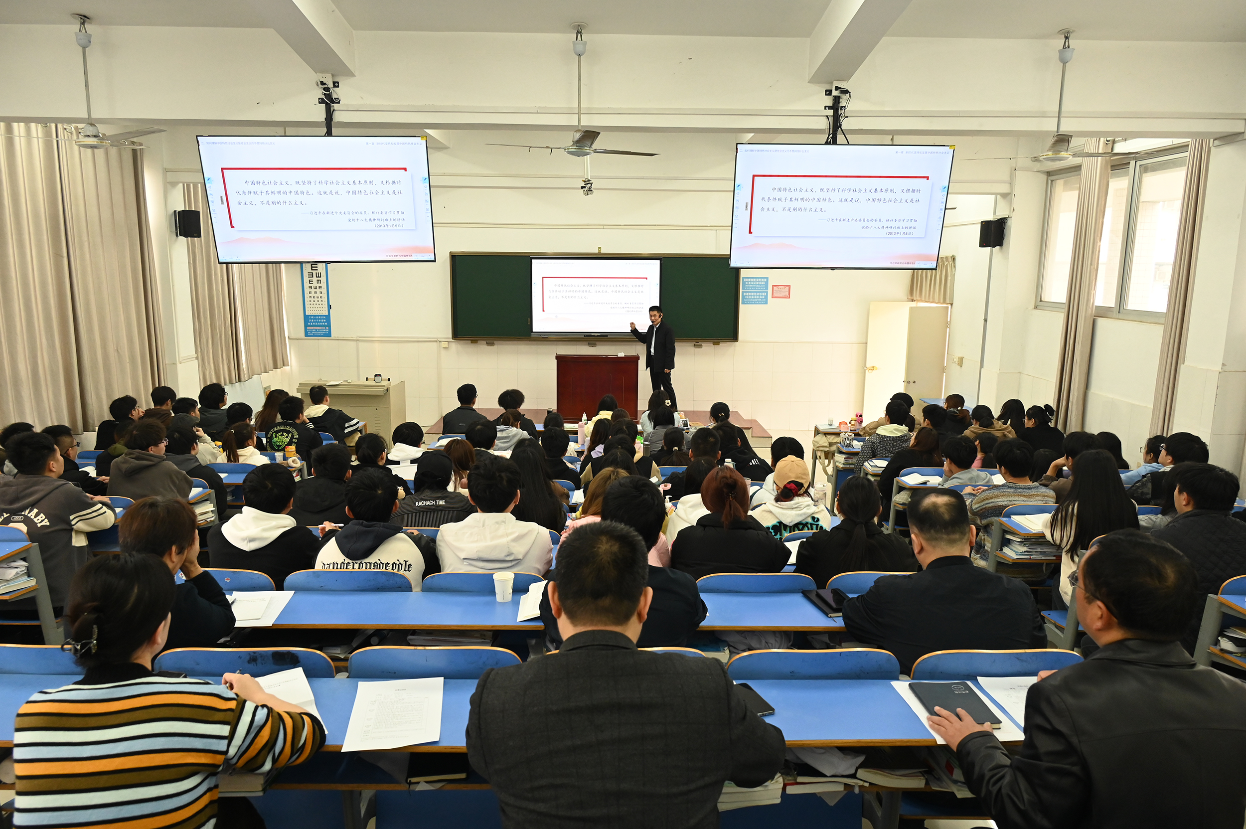 柳明伟认真听取了魏毅和傅晓两位老师讲授的《习近平新时代中国特色社会主义思想概论》课程。柳书记先后在22级国教临床1班听取了魏毅老师讲授的《新时代坚持和发展中国特色社会主义》专题和22级骨伤2班听取了傅晓老师讲授的《以中国式现代化全面推进中华民族伟大复兴》专题。