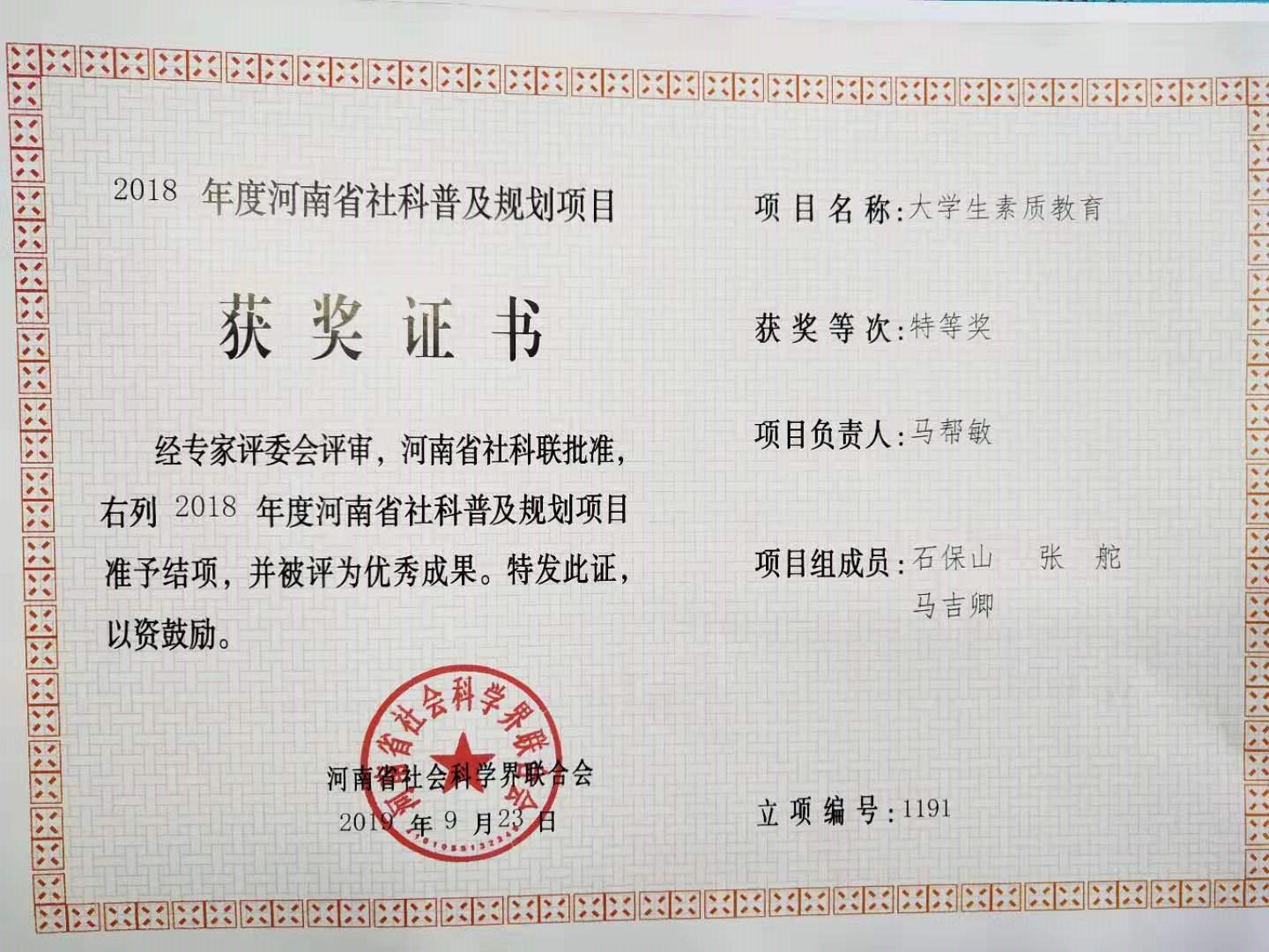 政教部马帮敏老师荣获省社科普及规划项目特等奖