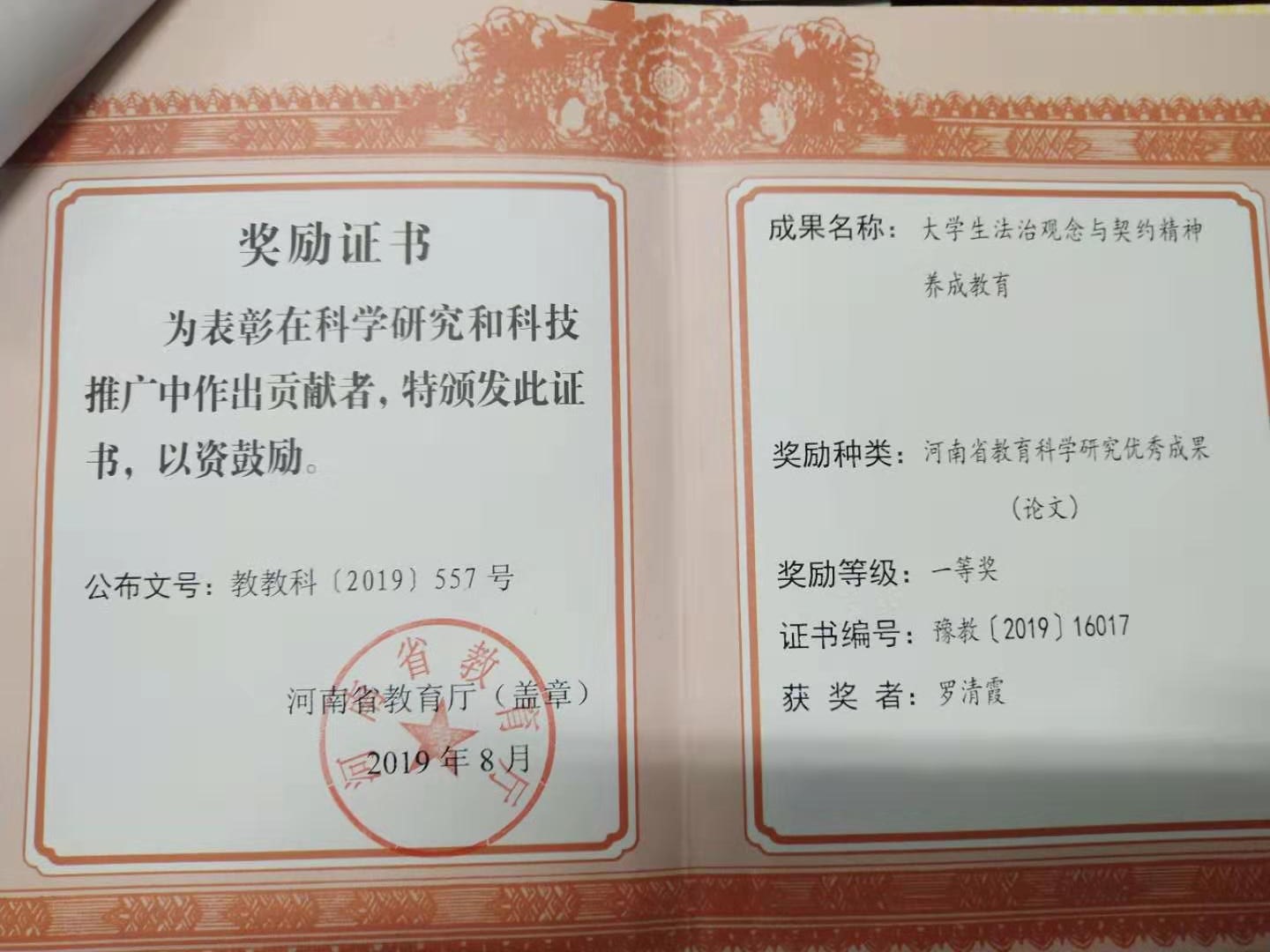 政教部罗清霞老师荣获省教育科学研究优秀成果一等奖