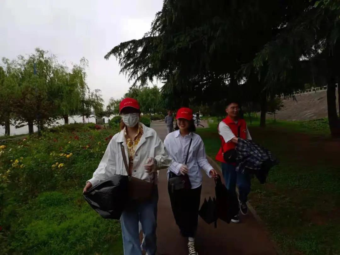 志愿活动伊始,天空下起了小雨,参加活动的同学们不畏艰难,坚持如期参加活动。一路下着雨,大家打着伞,沿着中达路一直向东,缓步走进白河国家城市湿地公园。