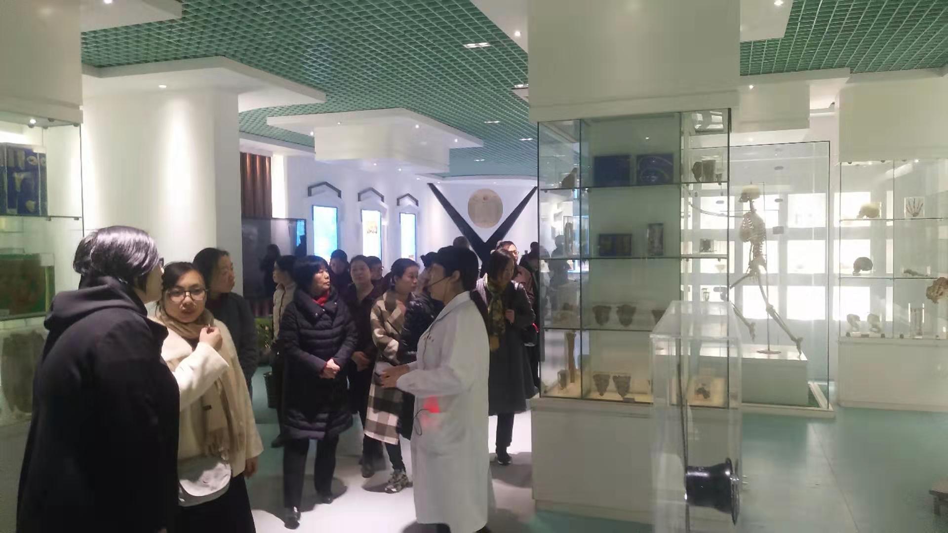 冯晓青主任带领大家参观了正常解剖标本厅、病理解剖标本厅、寄生虫标本厅和传染病艾滋病标本厅等一主三副四个大厅。首先,在“思考者”人体标本雕塑前,全体教师肃立鞠躬,表达对生命的敬畏、对医学的敬仰和对生命守护者的敬佩。接着,在基础部宫宝老师的细致讲解下,老师们边参观、边交流。