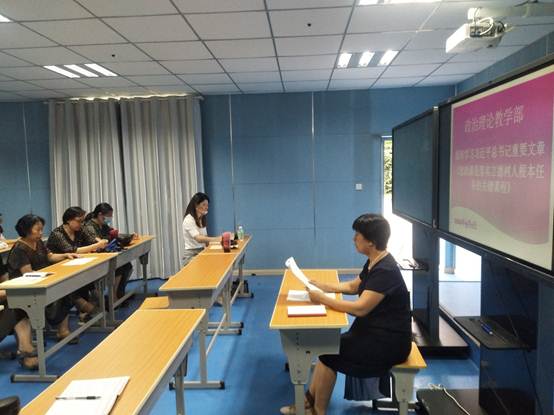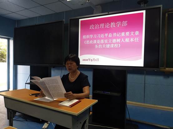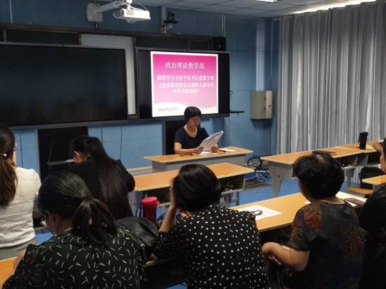 为进一步加强我校思政课教师队伍建设,学好习近平新时代中国特色社会主义思想,贯彻好习近平总书记重要文章《思政课是落实 立德树人根本任务的关键课程》的“六要”“八个相统一”,政教部9月1日下午3点在部会议室组织学习习近平总书记重要文章《思政课是落实立德树人根本任务的关键课程》,政教部主任冯晓青主持,全校思政课专兼职教师参加。