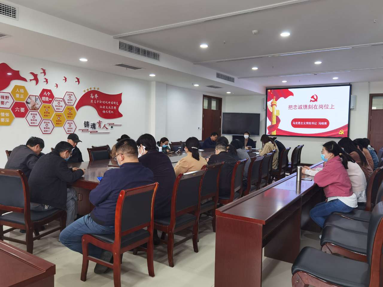 党课主要分为两部分。第一部分中,冯书记带领大家一起回顾了中国共产党的百年历程,她在党课中讲到,中共一大13位代表的人生,对于我们这些后人而言,是一本很好的教科书。他们当年都是播下了相同的革命希望,但最后走向了不同的人生归宿。从他们的进退沉浮之中,给了我们深刻的启示:一是要坚定信念,不忘初心;二是要坚信真理,不偏航向;三是要坚守气节,不褪本色。所以,新时代共产党人要牢记建党时的初心和使命,牢牢守住共产党人的精神家园。第二部分中,冯书记从忠诚不只是喊口号,更应体现在岗位上、清醒认识我们当前的工作状态、始终坚守爱岗敬业的责任操守和时刻保持爱岗敬业的精神状态四个方面全面阐述了作为一名共产党员在自己的工作岗位上应如何做到忠诚担当。党课最后,她号召全体党员同志们要有一颗酷爱本职的痴心、要有一颗坚守本职的恒心、要有一颗钻研本职的决心、要有一份献身本职的情怀和要有一种勇于创新的精神。进入新时代,踏上新征程!教书育人,立德树人,我们用知重负重、攻坚克难的实际行动诠释对党的忠诚和担当,坚定不移把我们的事业不断推向前进,直至光辉的彼岸。