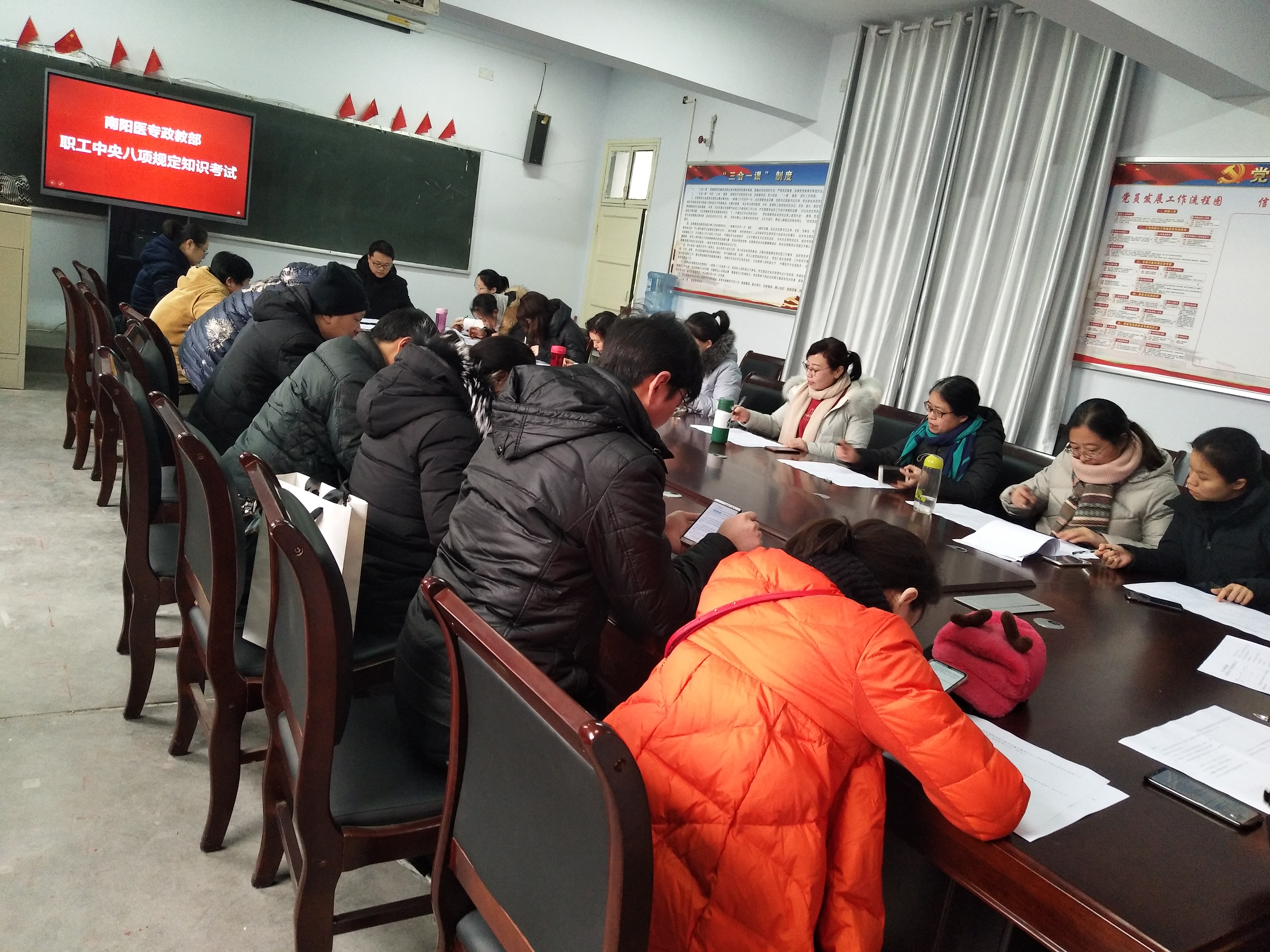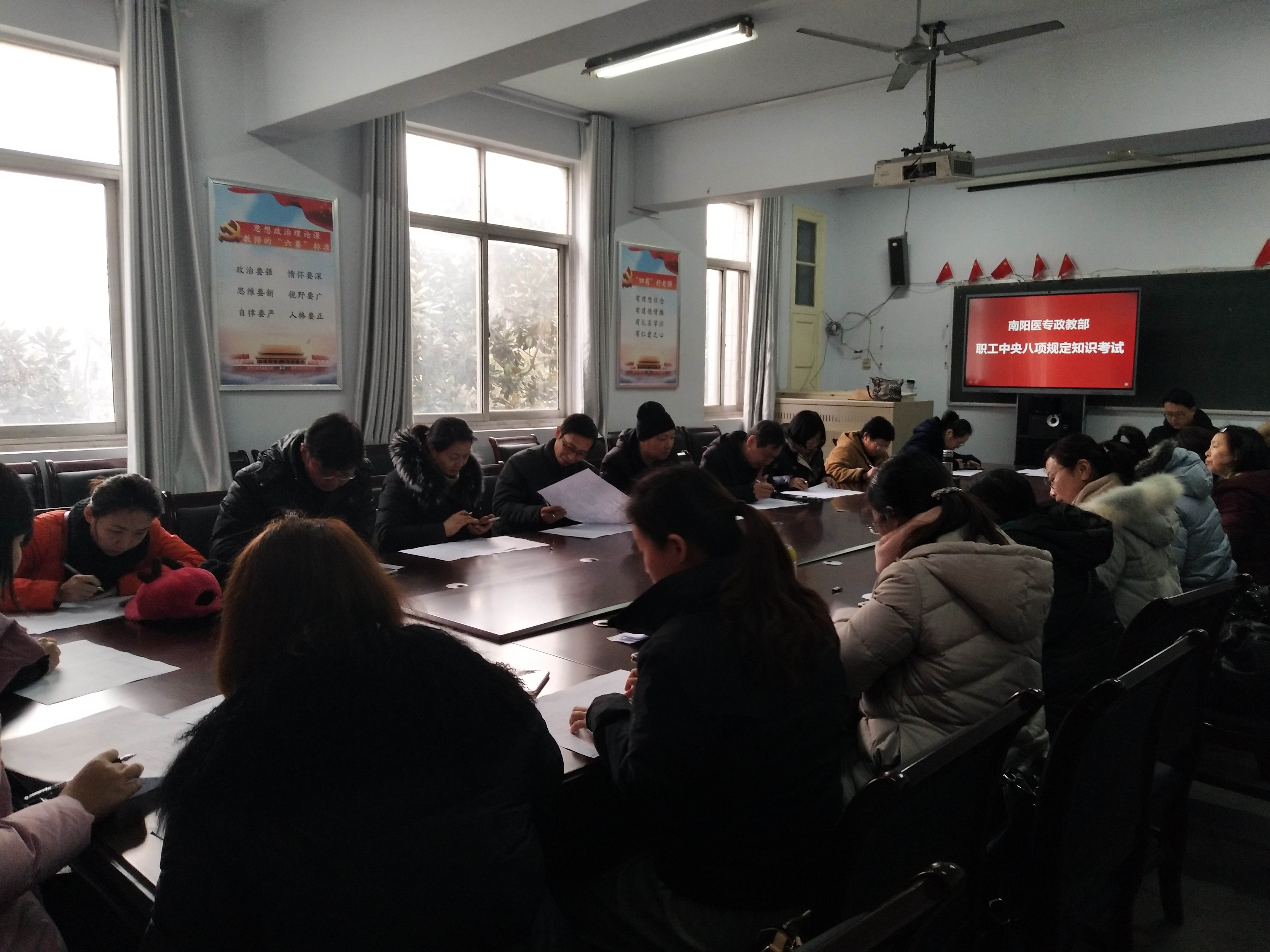 为在全体职工普及中央八项规定知识,强化落实中央八项规定精神警示教育作用,按照市纪委派驻组“中央八项规定知识测试春节前全体在岗在编人员全面考试”的通知要求,政教部于1月21日下午4点在部会议室组织全体教职工进行中央八项规定知识考试,全体教职工参加,政教部主任冯晓青负责监考。