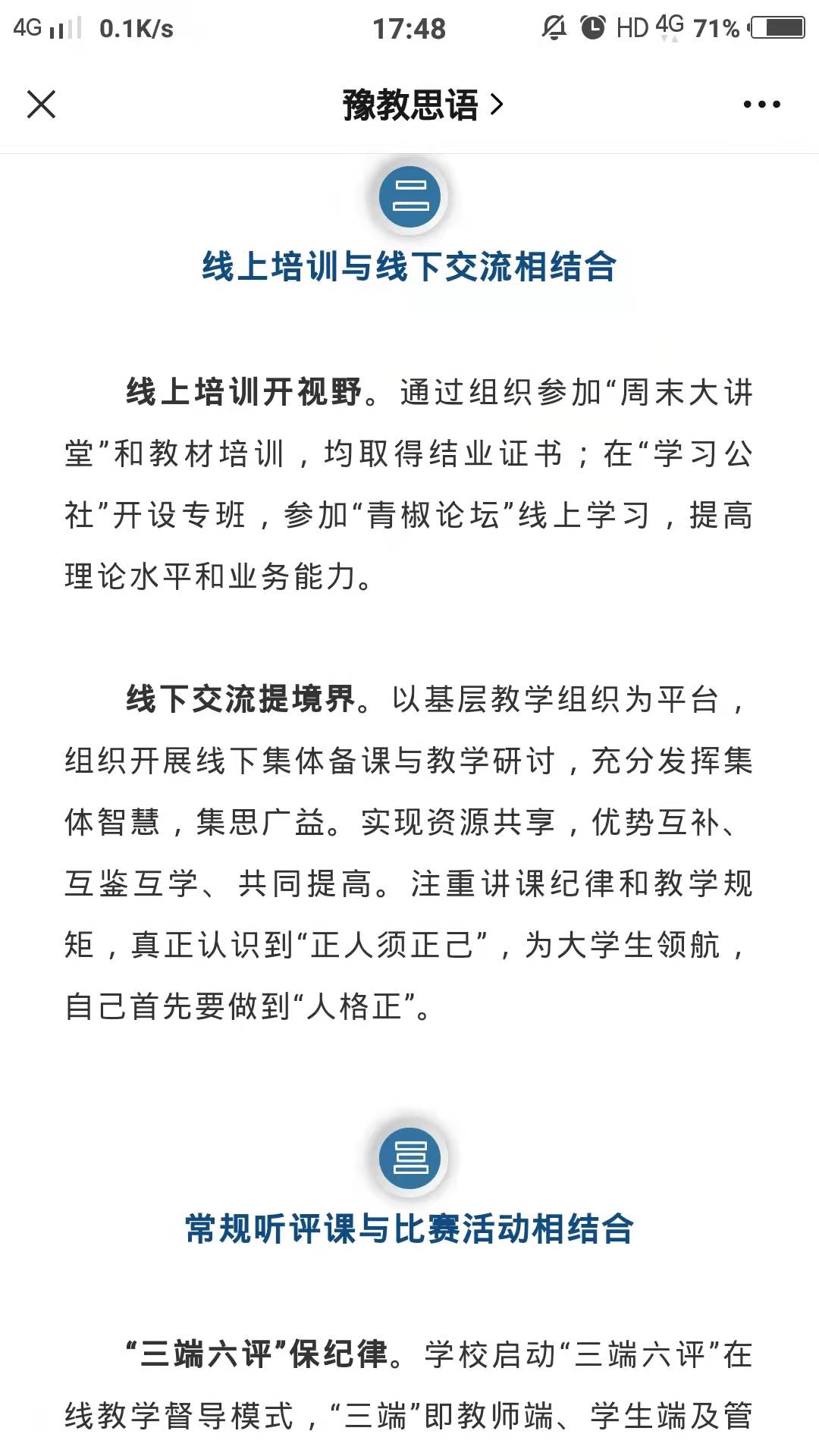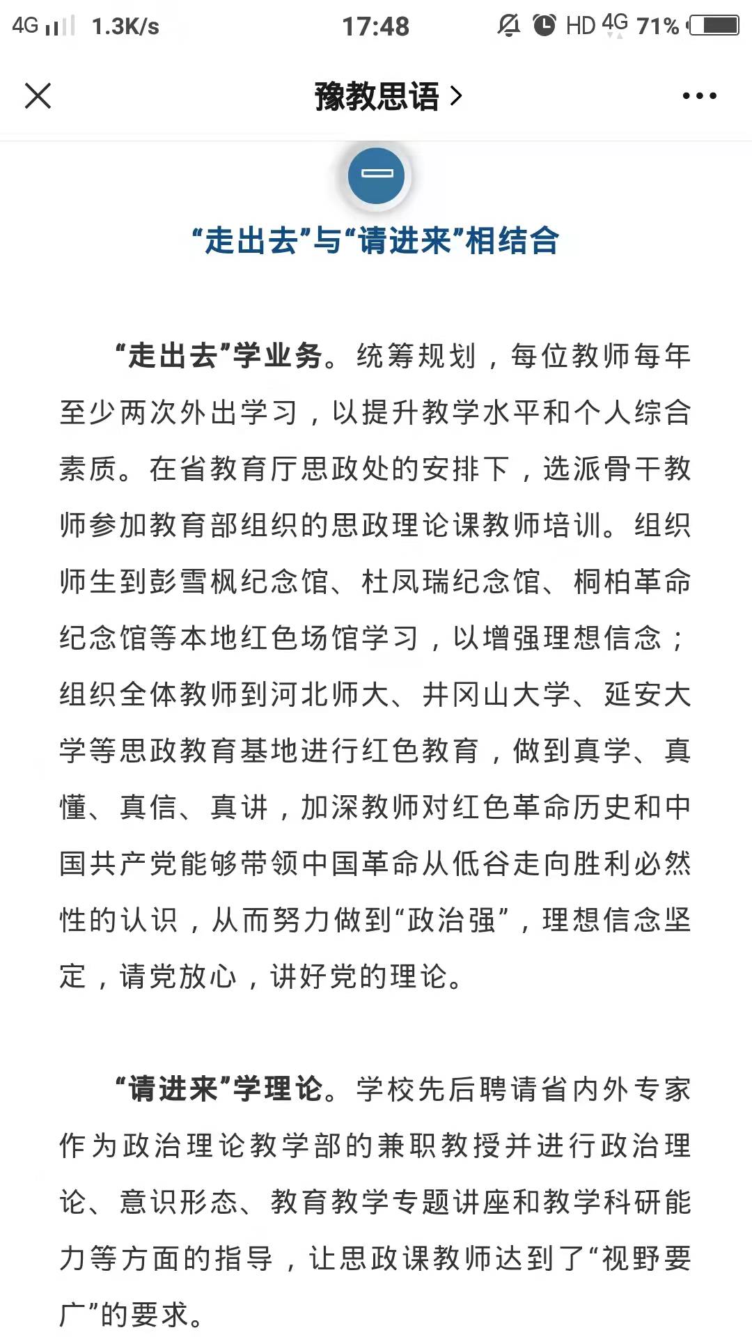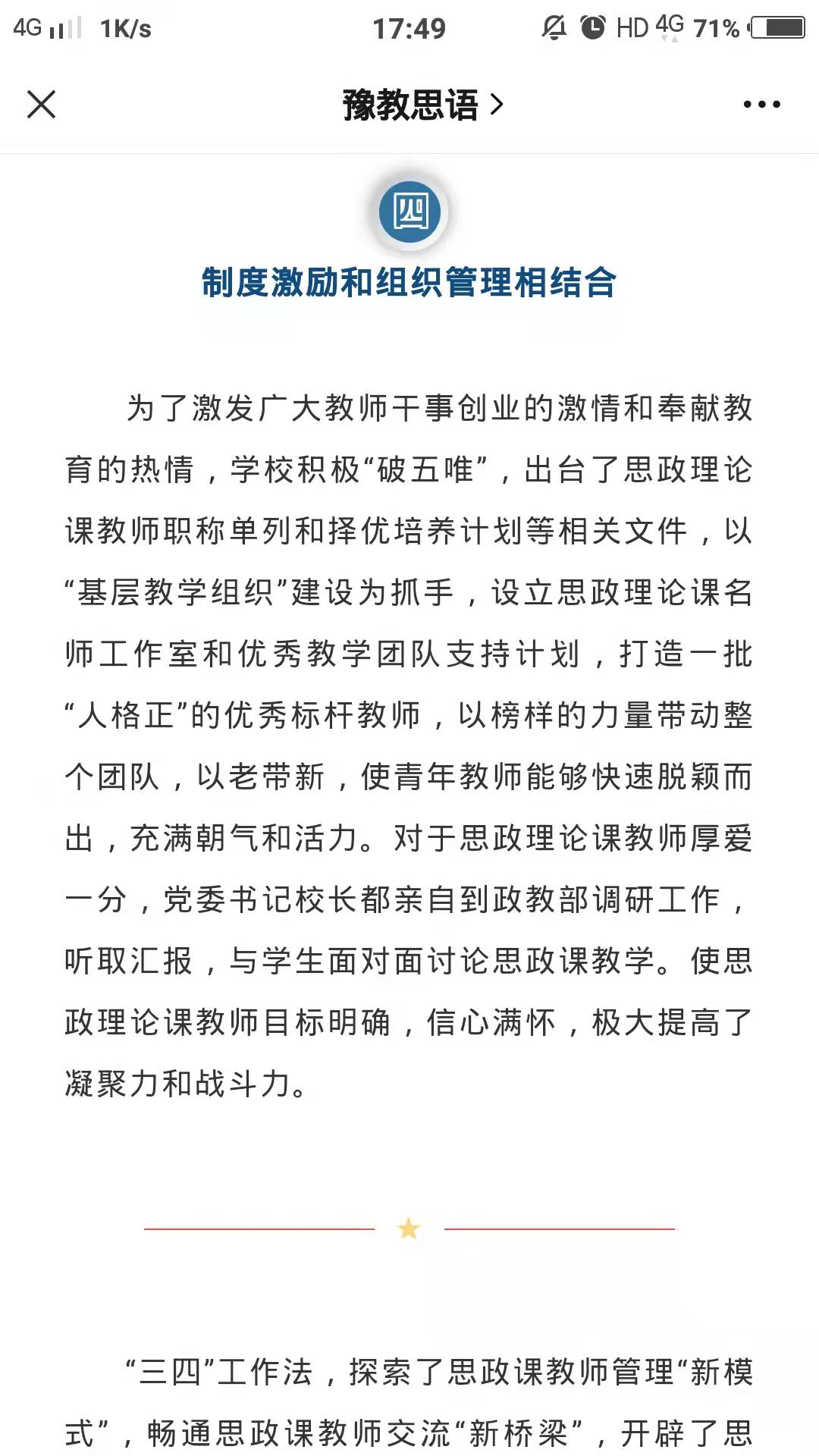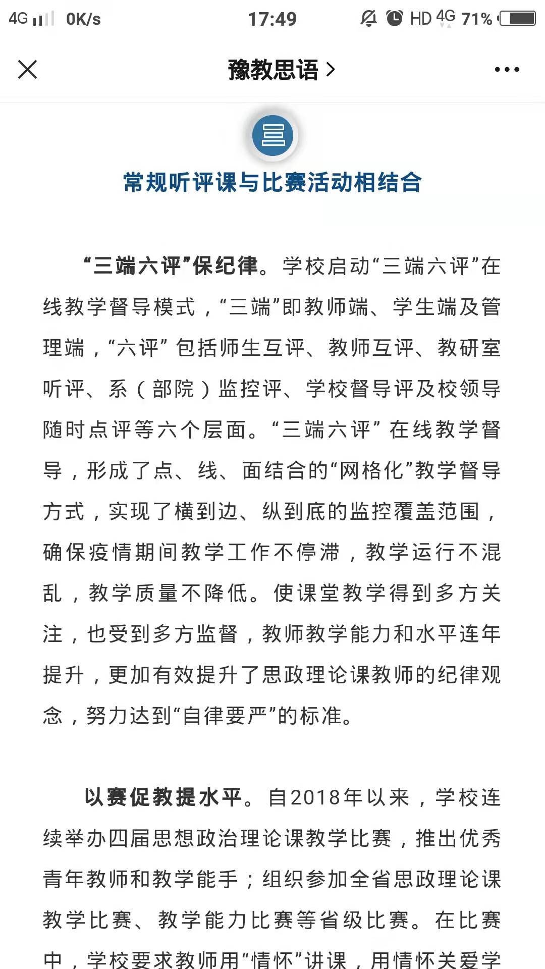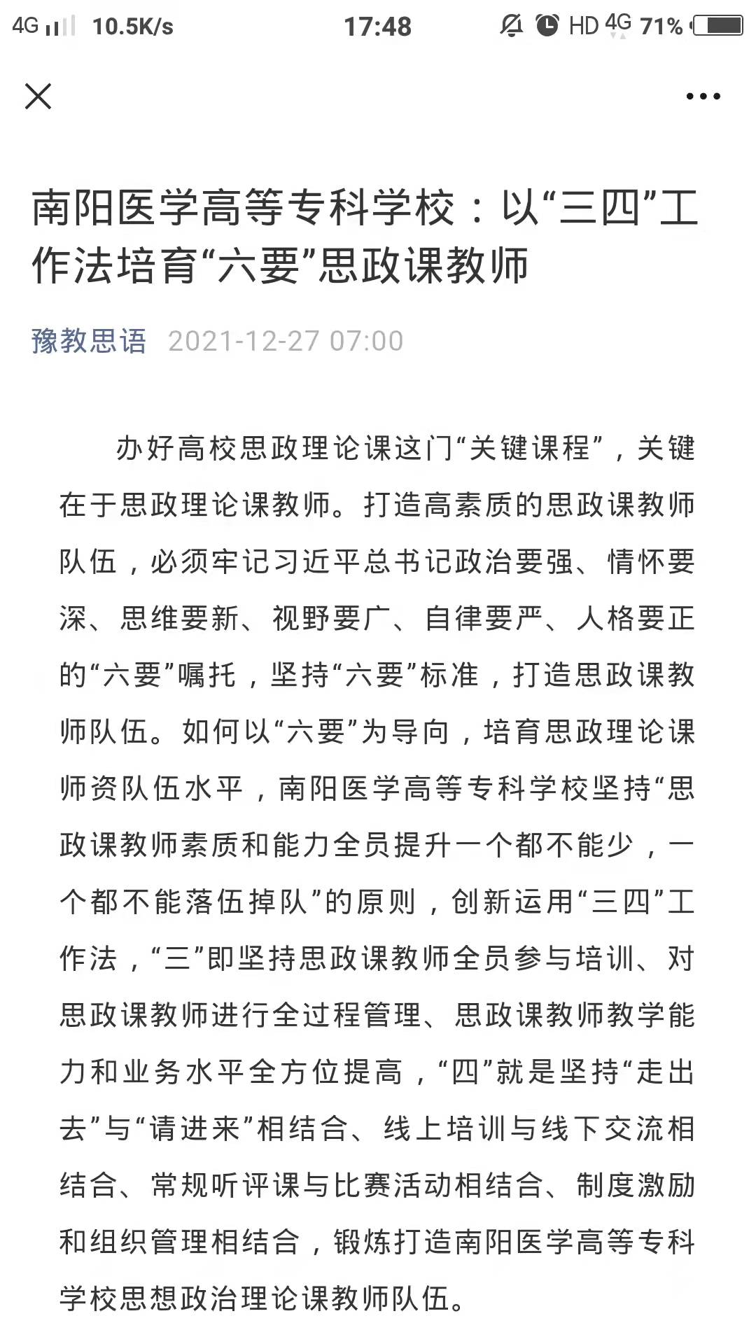 《南阳医专:以“三四”工作法培育“六要”思政课教师》在“豫教思语”推送报道