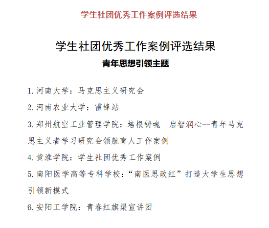 近日,省委教育工委、省教育厅公布了2021年全省高校学生社团品牌建设系列活动遴选结果,经学校推荐、专家评审等环节,评选出了六类十佳学生社团共60支,优秀工作案例5个主题共28个。9428cn太阳集团《“南医思政红”打造大学生思想引领新模式》荣获青年思想引领主题社团工作优秀案例。