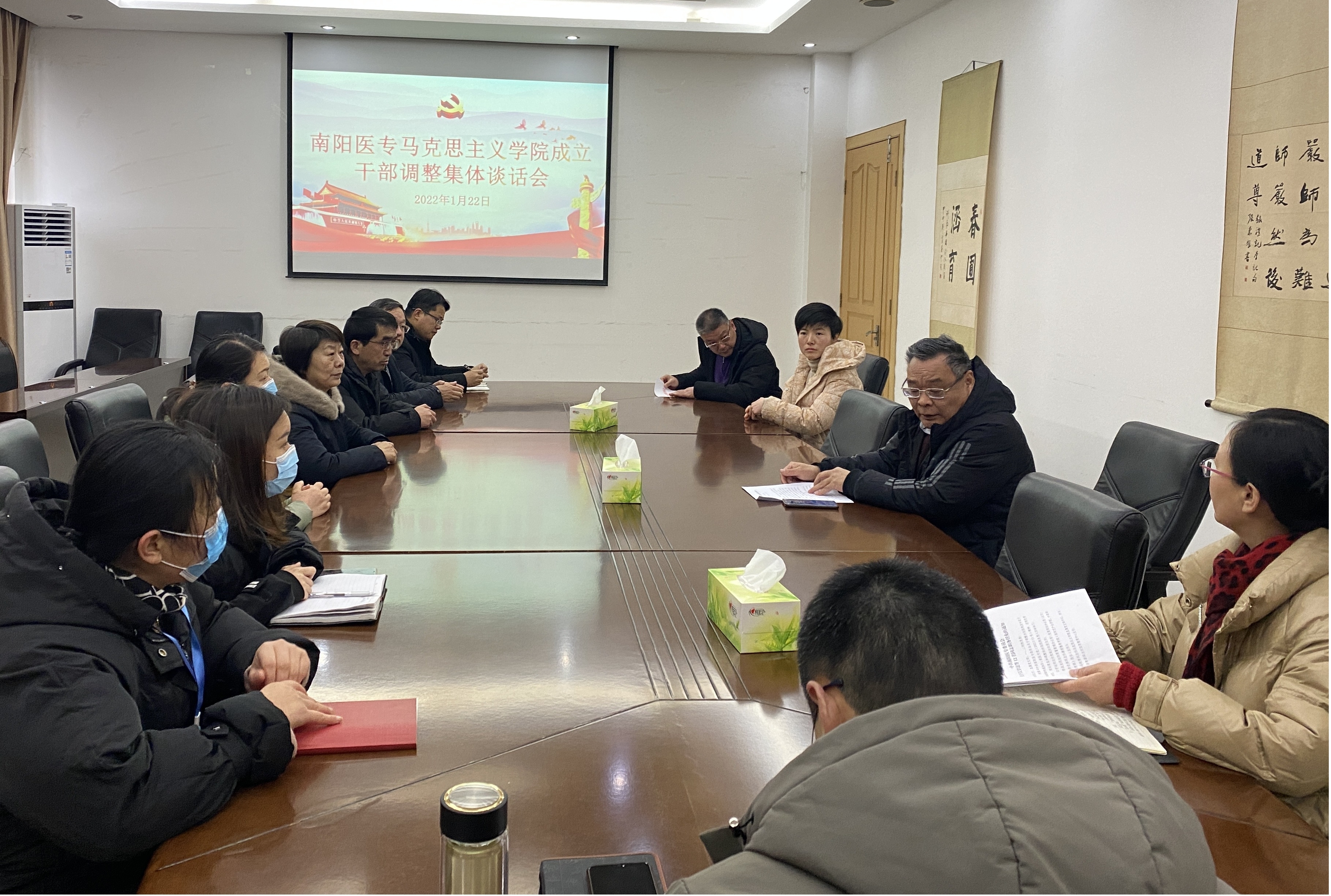 为深入贯彻实施《高等学校思想政治理论课建设标准(2021年本)》,进一步打造马克思主义理论教学、研究、宣传和人才培养的坚强阵地,提高思想政治理论课教学水平,2022年1月22日上午,我校9428cn太阳集团成立仪式在行政楼会议室举行,校党委副书记逵应坤出席会议,校党委组织部部长杜晓平主持,我院副科级以上干部、副高级以上职称教师代表参加。
