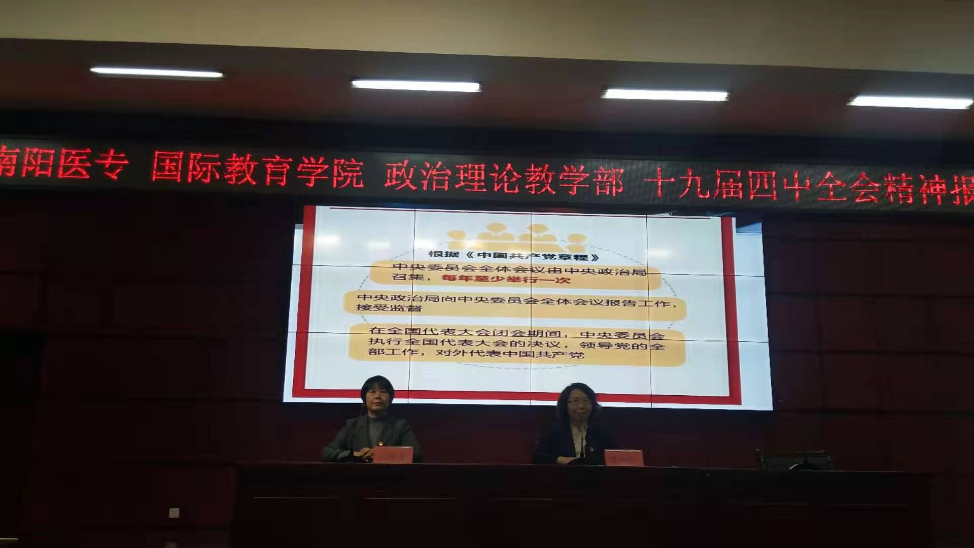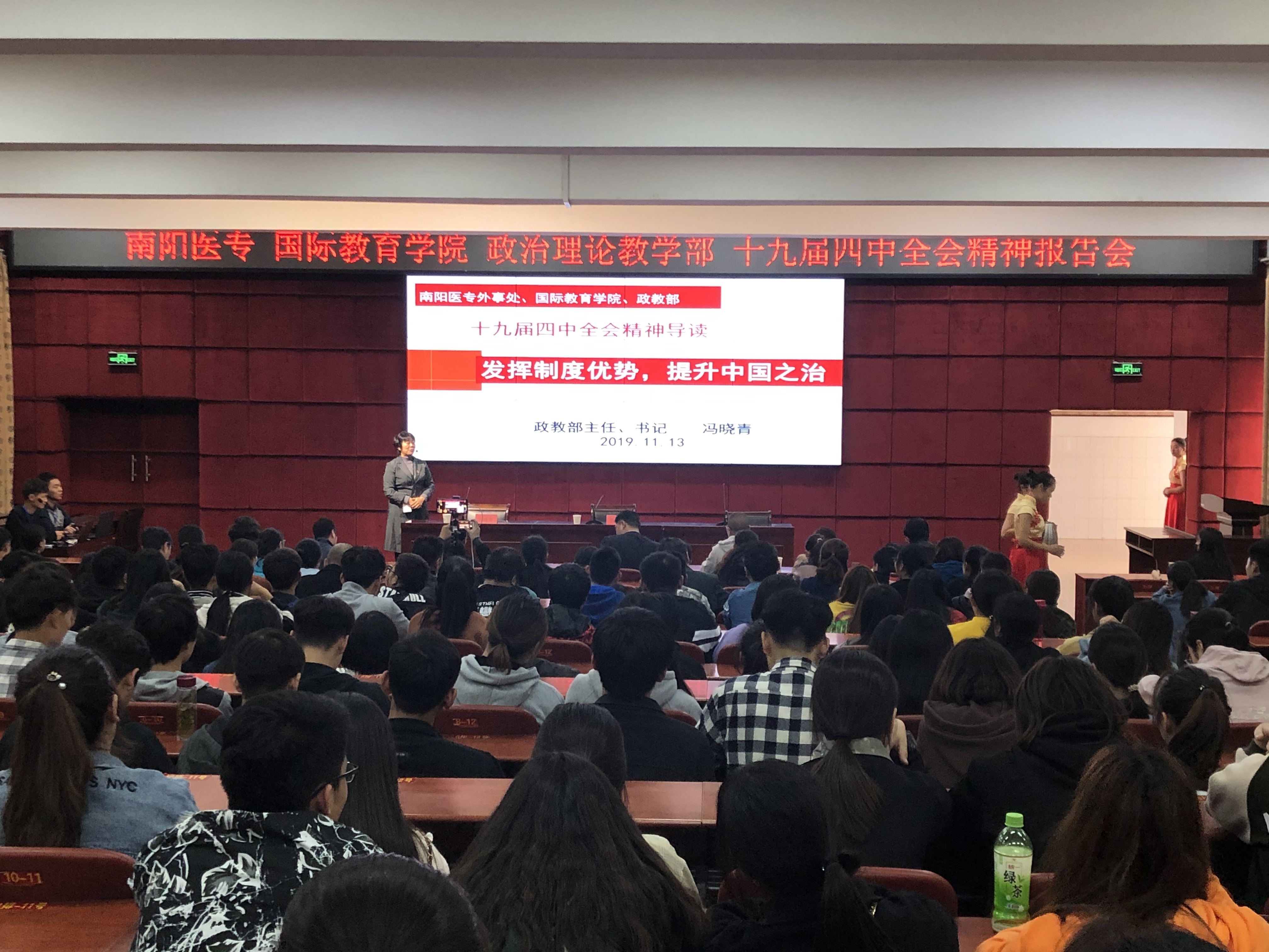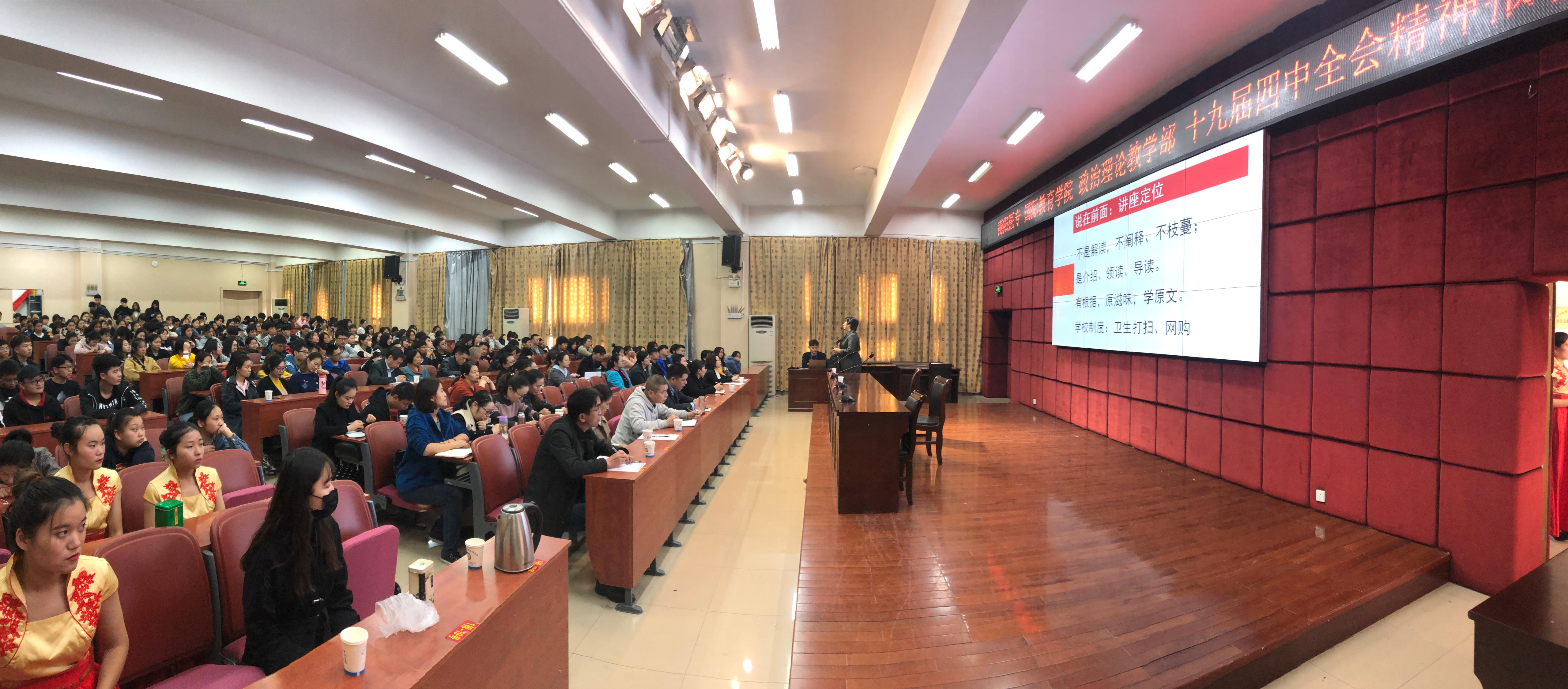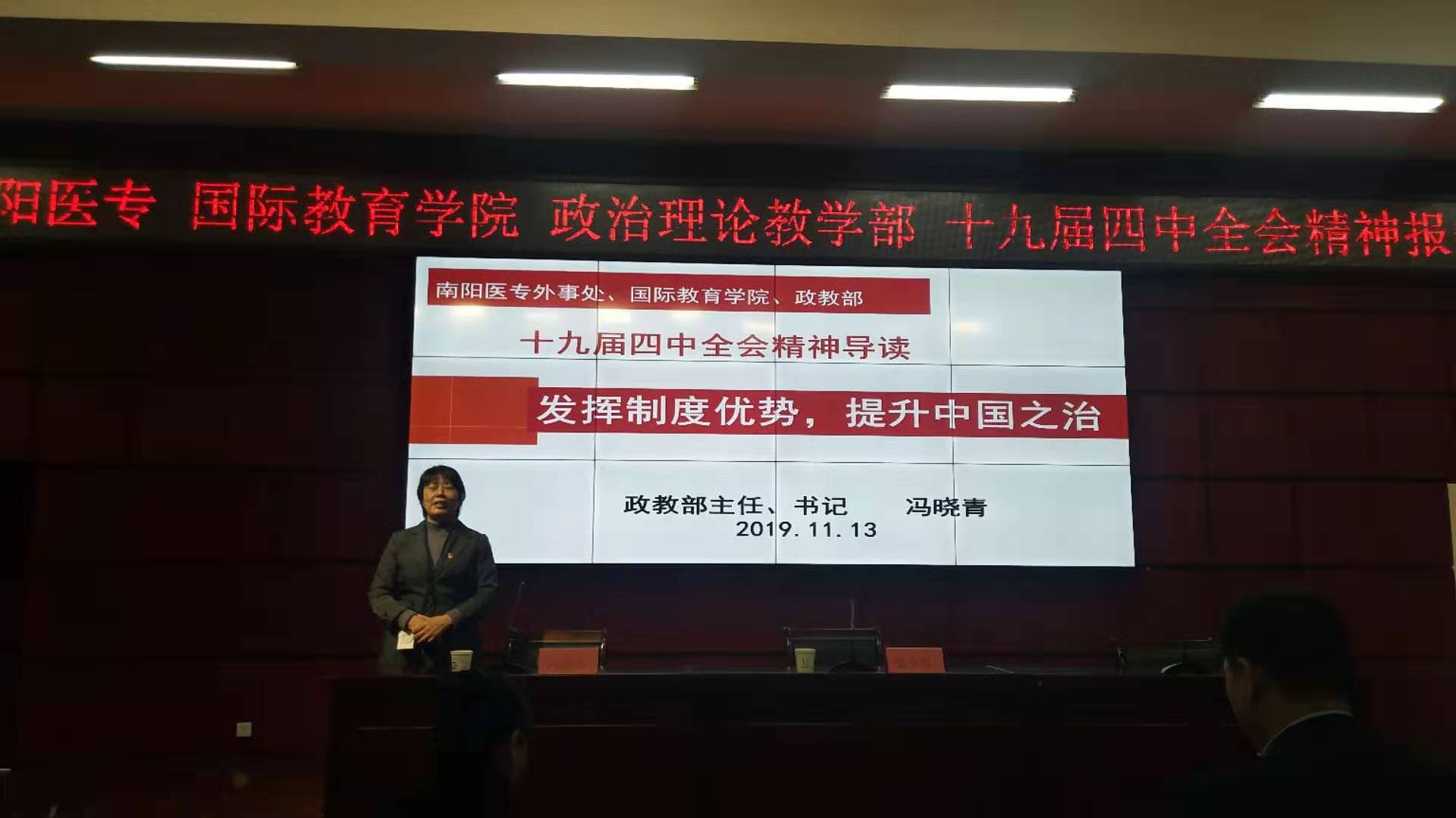 11月13日下午在仲景西区图书馆五楼报告厅,政治理论教学部与国际教育学院联合举办了学习党的十九届四中全会精神报告会。政教部直属党支部书记冯晓青教授为师生作《发挥制度优势,提升中国之治——党的十九届四中全会精神导读》专题报告。政治理论教学部、国际教育学院全体教职工和学生代表参加了报告会。